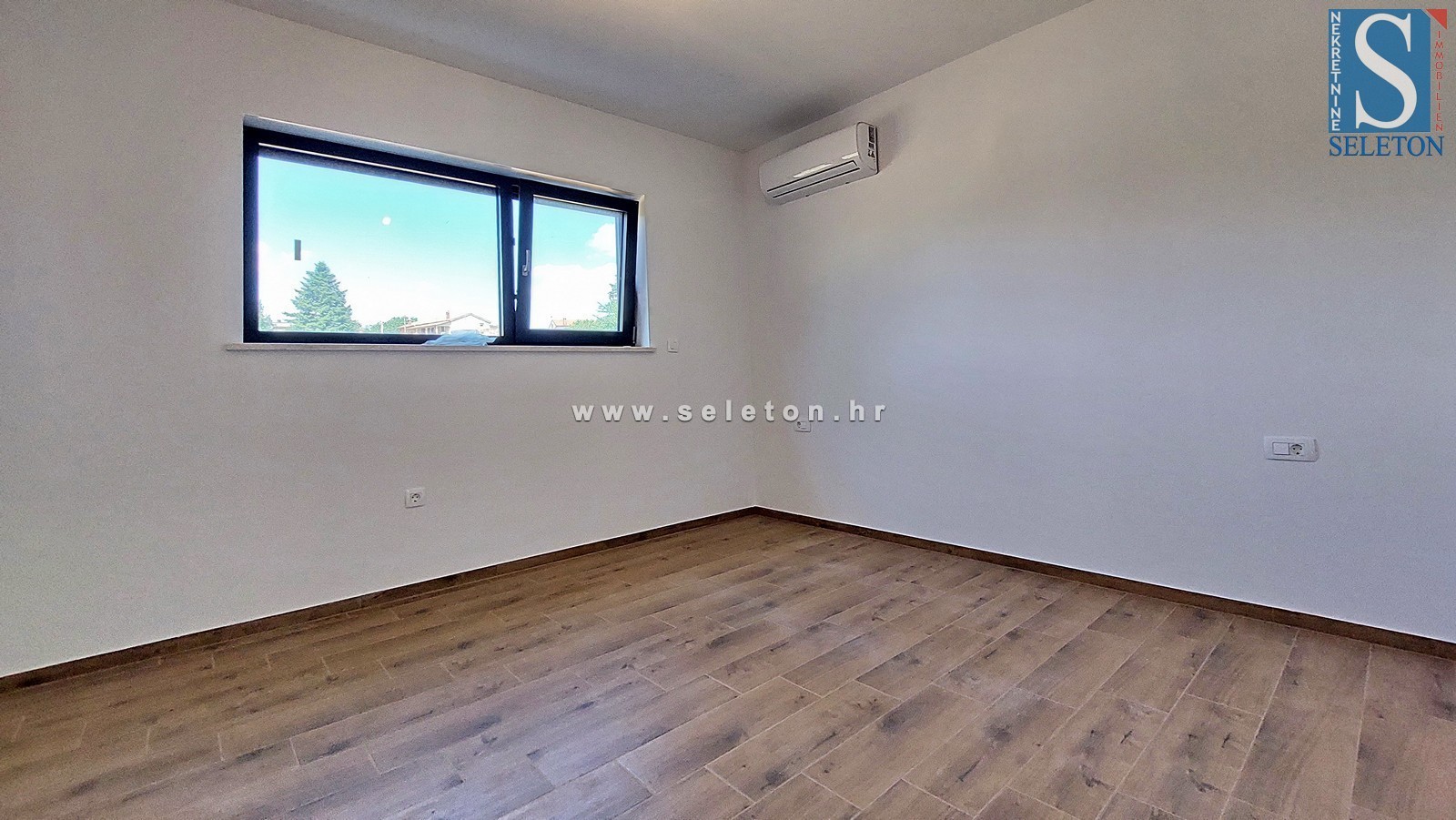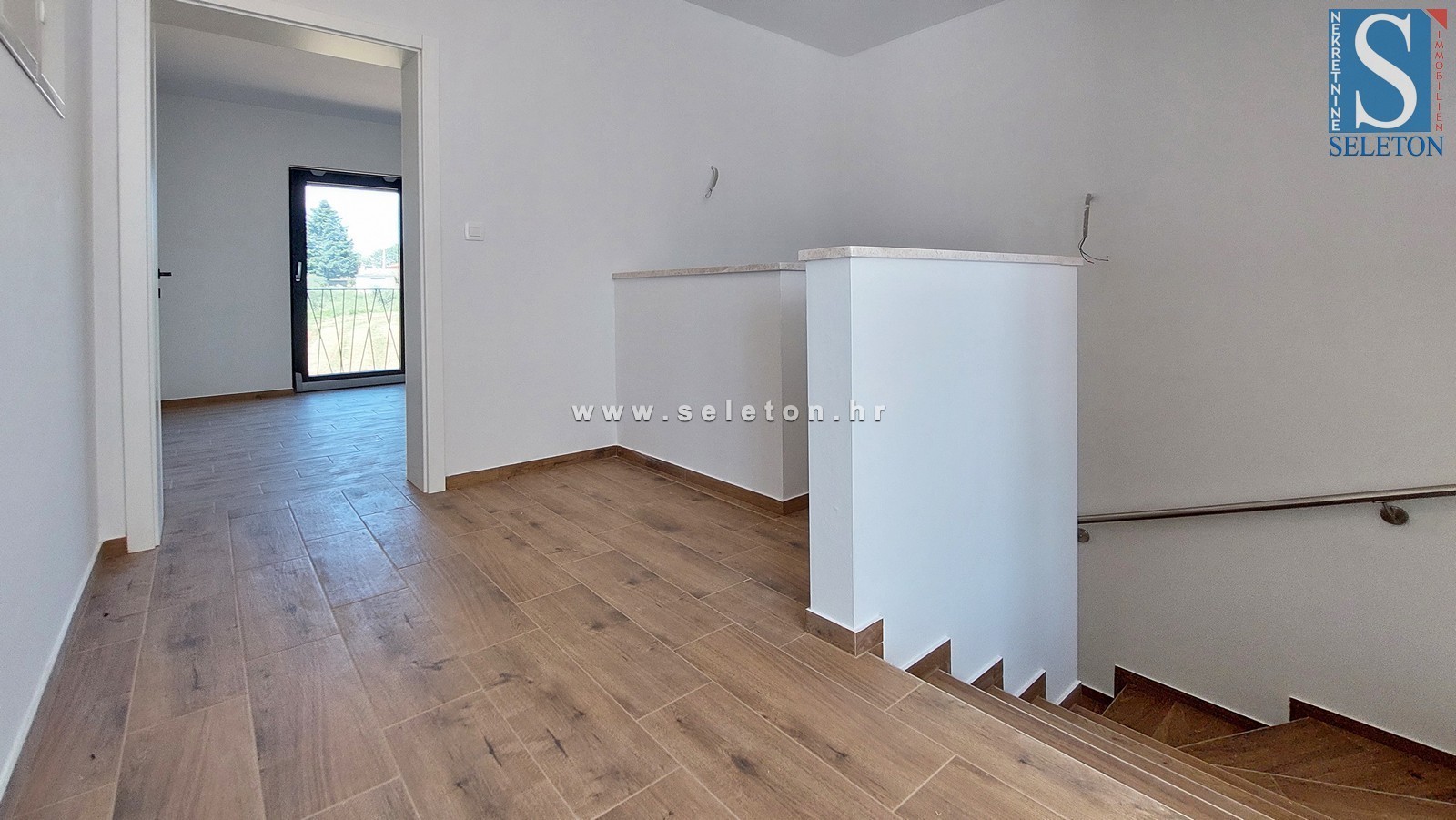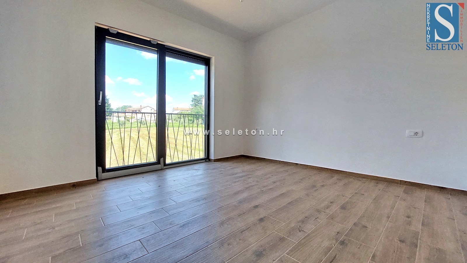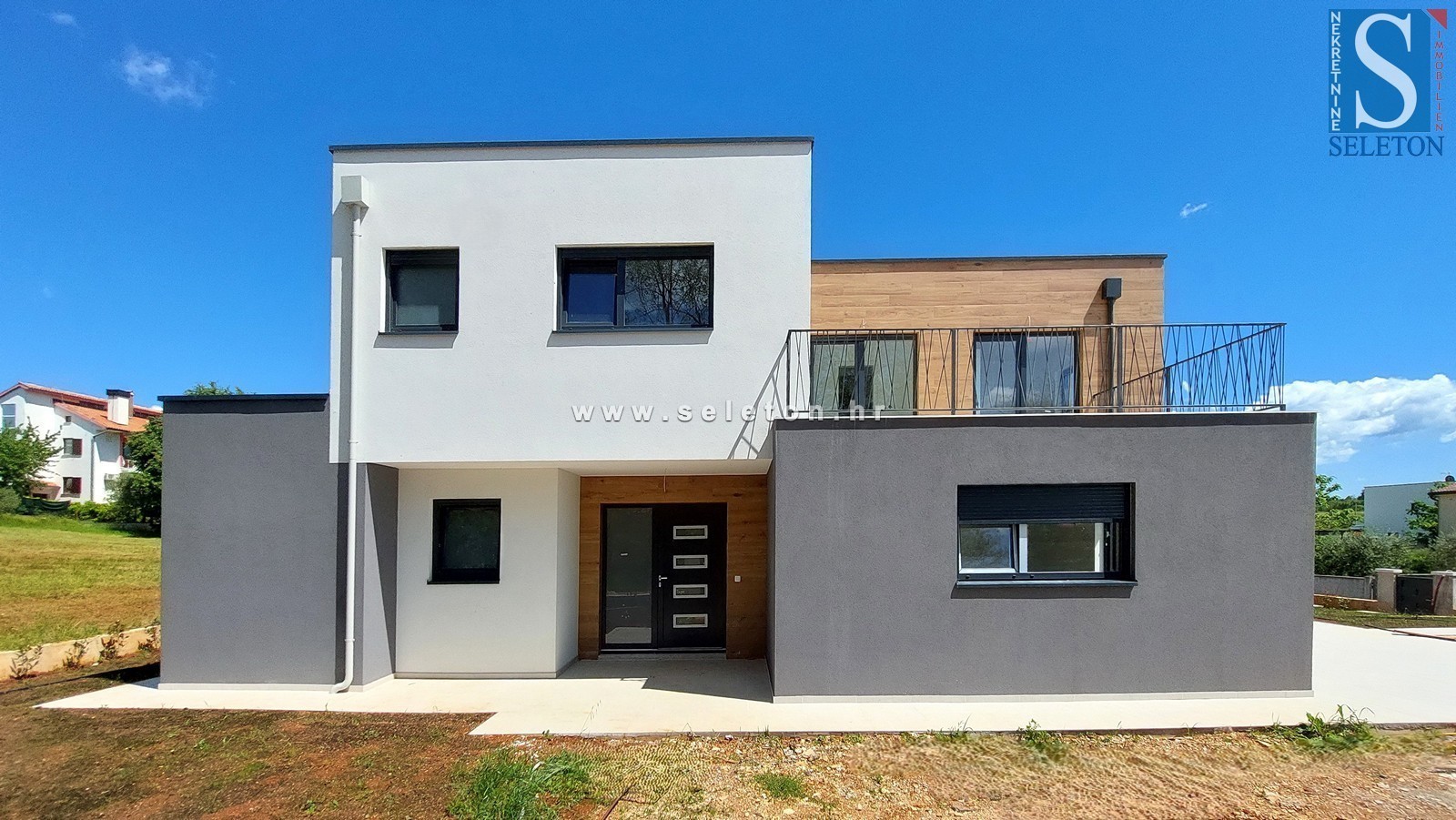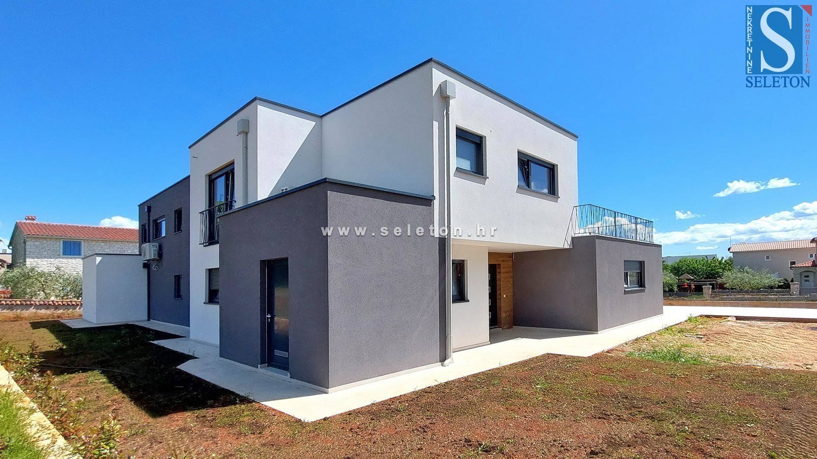 A modern semi-detached house with an area of 136 m² is for sale. It consists of a living room, kitchen, dining room, terrace, bedroom, bathroom, storage room, hallway and storage room on the ground floor and a hallway, 3 bedrooms, 2 bathrooms and a terrace on the first floor of the house. The house has electric underfloor heating, air conditioning in all rooms, the land has an area of 670 m², on which there are also 2 parking spaces and a swimming pool. The house is approx. 8 km from Poreč and 9 km from the sea.