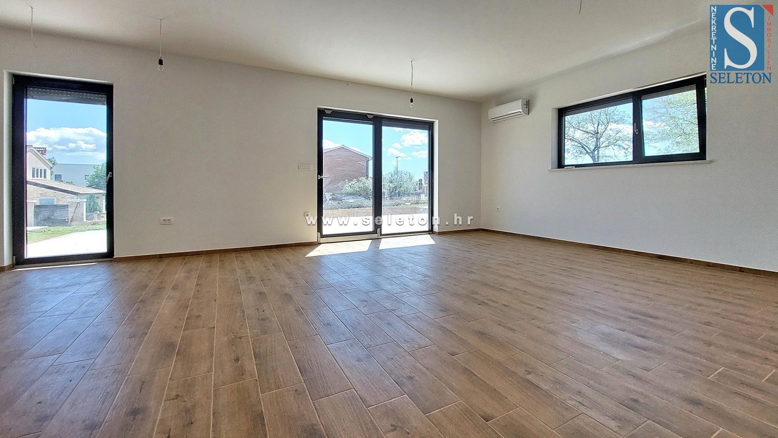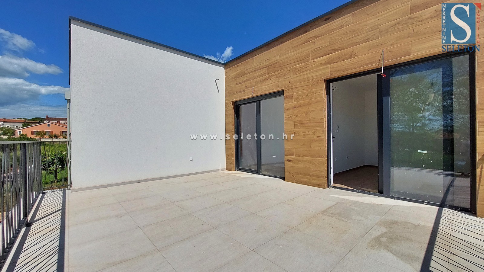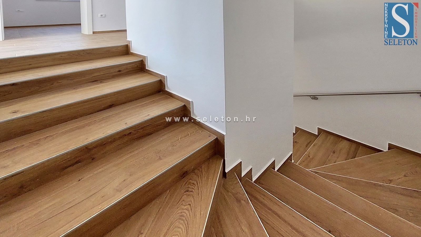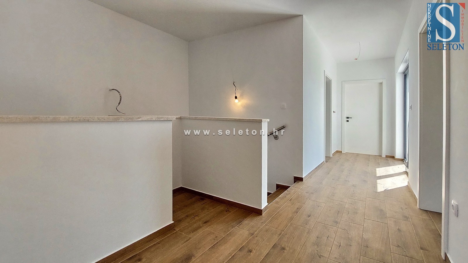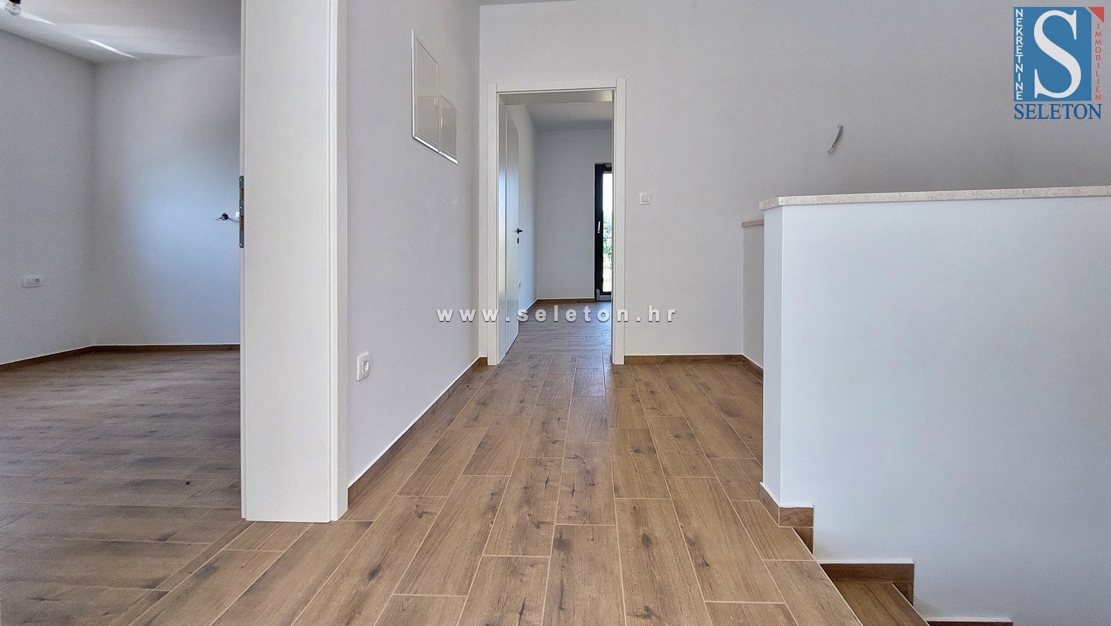 A modern semi-detached house with an area of 136 m² is for sale. It consists of a living room, kitchen, dining room, terrace, bedroom, bathroom, storage room, hallway and storage room on the ground floor and a hallway, 3 bedrooms, 2 bathrooms and a terrace on the first floor of the house. The house has electric underfloor heating, air conditioning in all rooms, the land has an area of 670 m², on which there are also 2 parking spaces and a swimming pool. The house is approx. 8 km from Poreč and 9 km from the sea.
