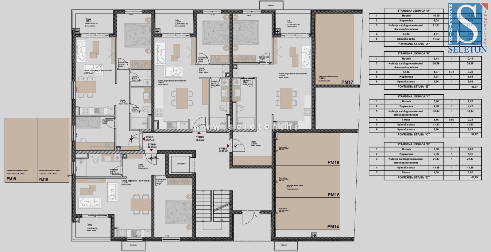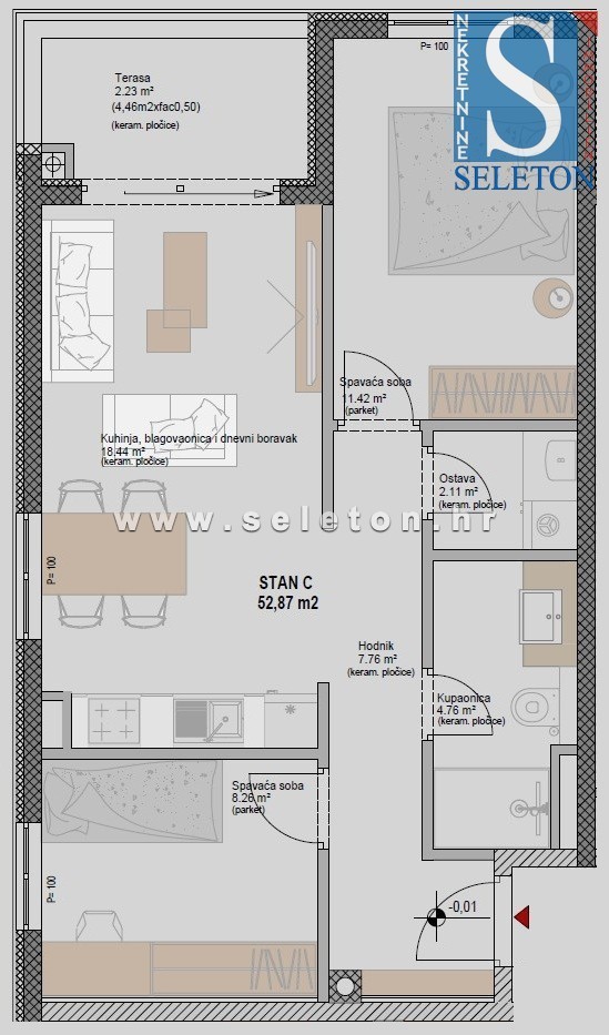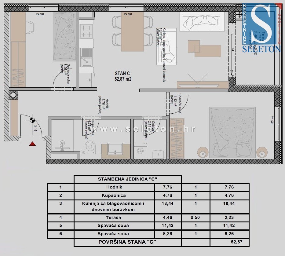 Poreč-Parenzo, nelle immediate vicinanze del centro città, al piano terra di un moderno edificio con ascensore e garage sotterraneo, è in vendita un nuovo appartamento di 53 m², composto da zona giorno, terrazza coperta, disimpegno, 2 camere da letto, ripostiglio e bagno. L'appartamento è dotato di riscaldamento a pavimento in tutto l'appartamento (pompa di calore Daikin Altherma), l'acqua calda è prodotta tramite una pompa di calore con serbatoio da 160 litri, sono presenti 3 condizionatori Daikin (in soggiorno e nelle camere da letto), finestre in PVC a tre vetri, zanzariere e tapparelle motorizzate, la porta d'ingresso dell'appartamento è antieffrazione e ignifuga. L'edificio è dotato di una facciata in lana di roccia di 12 cm di spessore che, insieme alle finestre in PVC a tre vetri, garantisce un isolamento termico e acustico superiore, nonché un'elevata efficienza energetica dell'appartamento stesso. L'appartamento si trova in una posizione tranquilla e attraente, a circa 1,3 km a piedi dal mare/spiaggia e a 2,5 km dal centro di Poreč-Parenzo. Il prezzo dell'appartamento non include il posto auto; gli acquirenti possono scegliere tra le seguenti opzioni: